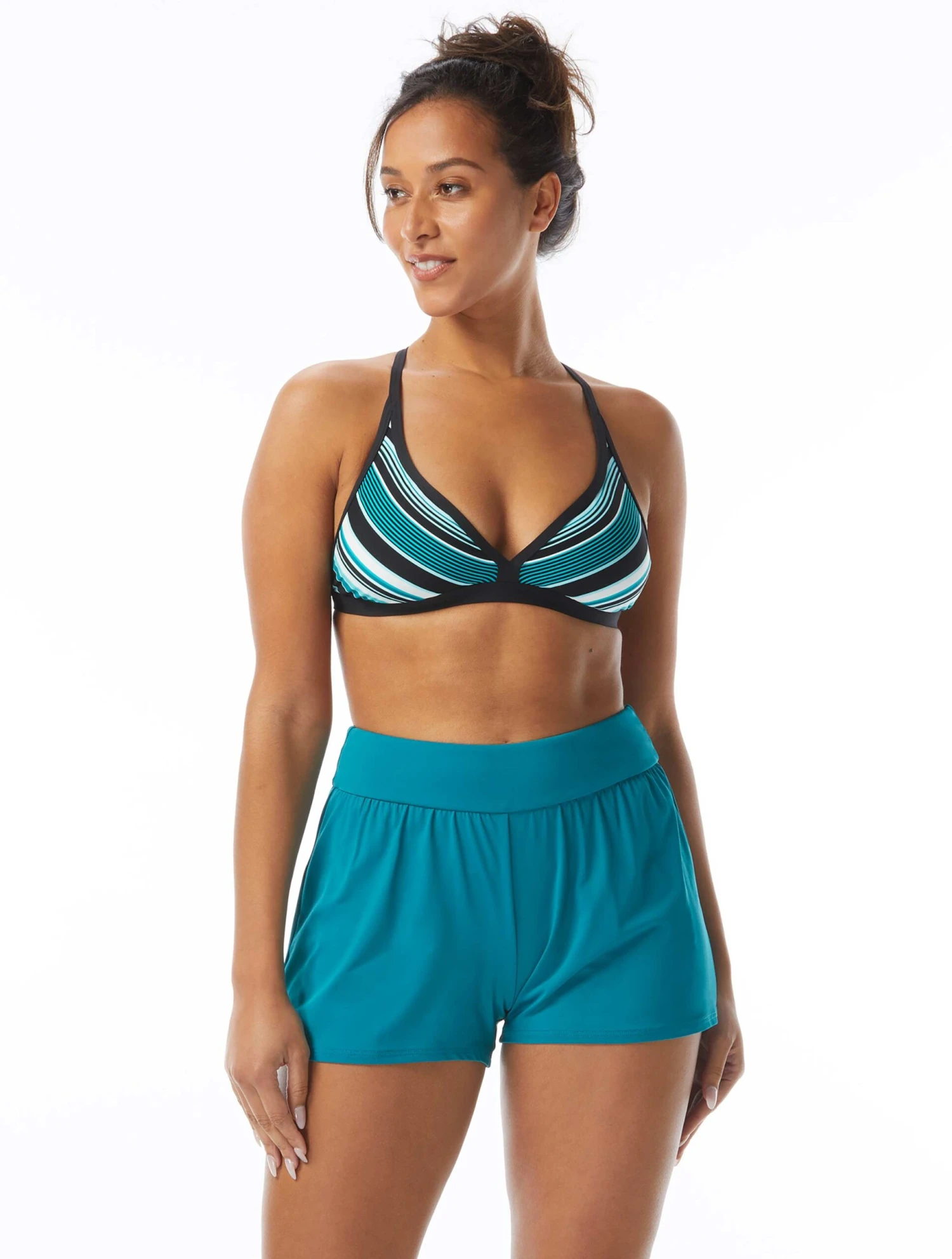 A sporty top to keep you active in style, meet the Beach House Sport Venus Sporty V-Neck Bikini Top. In a shoreline inspired stripe print, paired with adjustable straps, ultra cool mesh lining, removable soft cups and tie back, this bikini top will take you from sunrise yoga to sunset paddle boarding.