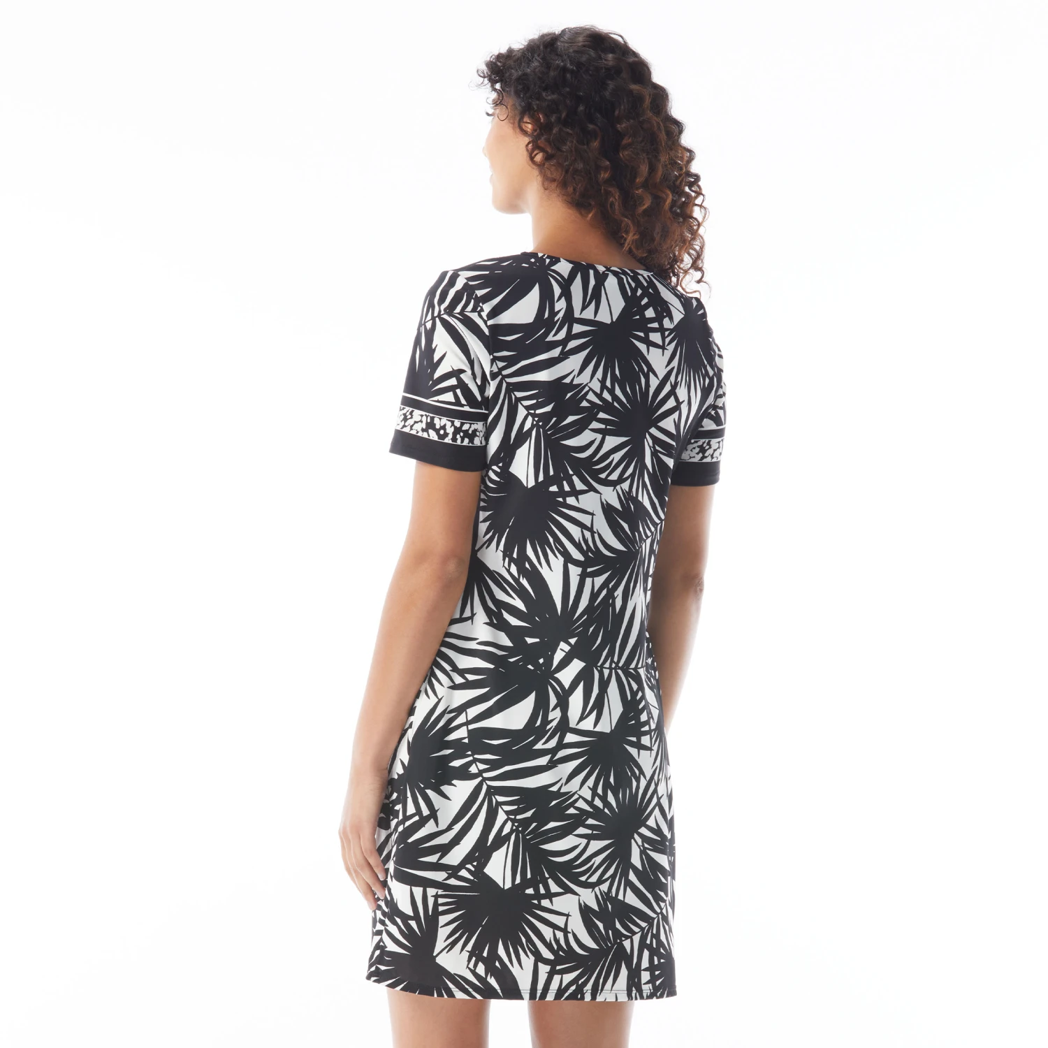 Beach House Style Classic T-Shirt Dress is the prefect, laid-back style to take you from sunrise to sunset. The ultra-flattering dress is complimented by a chic black and white palm print, in a light-weight, UPF 50+ sun protect fabric made with recycled materials.