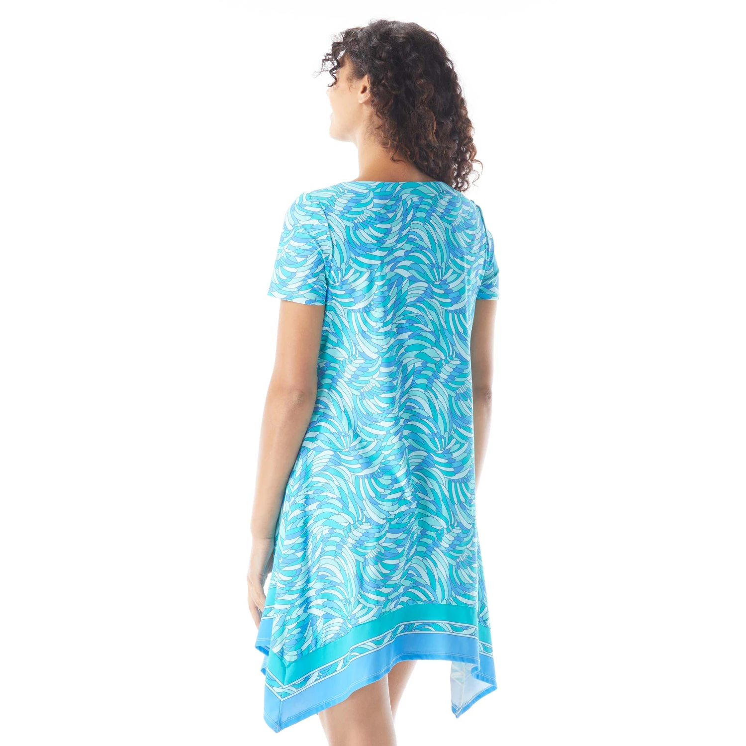 The Beach House Style Skylar Scarf Hem T-Shirt Dress Is stylish and figure flattering. The pointed hem, bold multi-color print and complimenting border make this a silhouette to truly stand out in. All Beach House Style dresses provide UPF 50+ sun protection to take you from sunrise to sunset and are made with recycled materials.