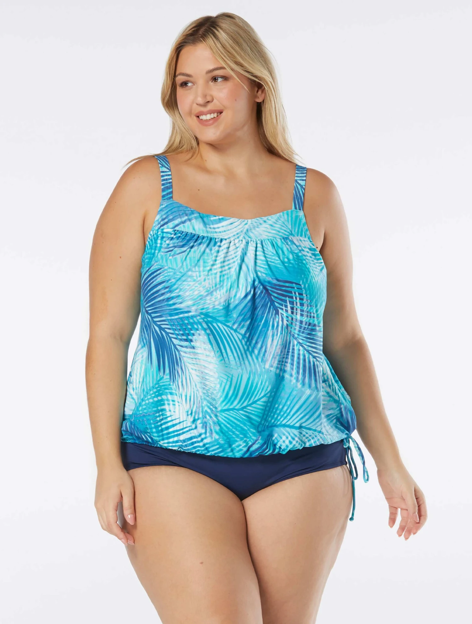 Spend your day by the sea in the Beach House Swim Plus Size Audrey Blouson Tankini Top. This flattering top features a flowing bodice that gathers gracefully at the hemline with an adjustable drawcord. The flowing bodice pairs well with a fun, fern print for a must-have tankini top! Beach House swimwear is designed with high-end fabrics that bend with you for extra comfort, easy fit and shape retention.