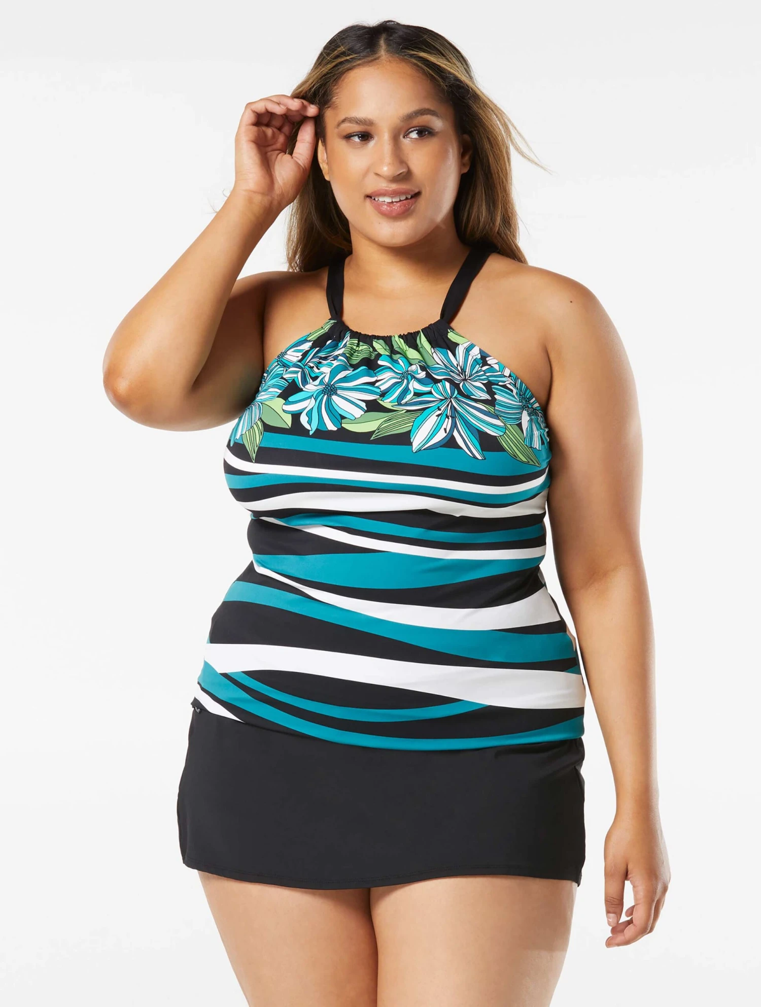 The Beach House Plus Size Blair High Neck Tankini Top is designed with a contemporary high neckline and adjustable straps for a comfortable and customizable fit. This tankinis colorful abstract stripe print with floral accent is eye-catching and stylish. Beach House swimwear is designed with high-end fabrics that bend with you for extra comfort, easy fit and shape retention.