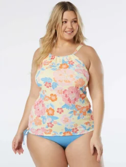 The Beach House Plus Size Blair High Neck Tankini Top is designed with a contemporary high neckline and adjustable straps for a comfortable and customizable fit. This tankinis fun, floral print is eye-catching and stylish. Beach House swimwear is designed with high-end fabrics that bend with you for extra comfort, easy fit and shape retention.