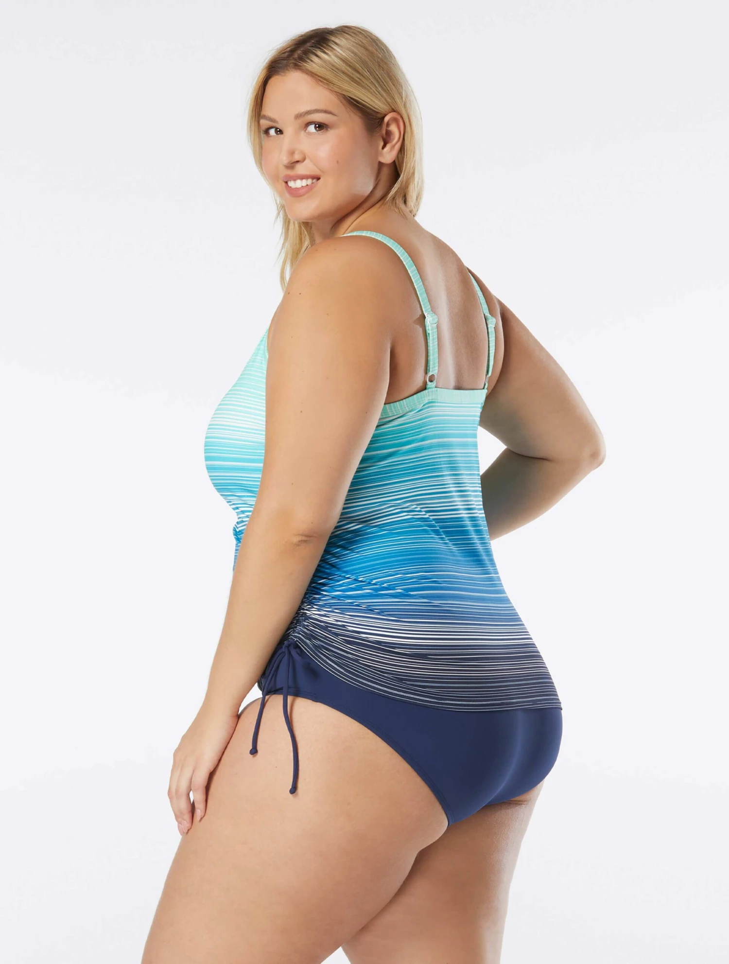 Take your outfit from beach to street in the Beach House Swim Plus Size Bridget Side Shirred Underwire Tankini Top. In a vibrant stripe inspired by hues of the sunset paired with a side drawstring that creates a figure flattering, asymmetrical silhouette, while the U-neckline adjustable straps and underwire provide support. Beach House swimwear is designed with high-end fabrics that bend with you for extra comfort, easy fit and shape retention.