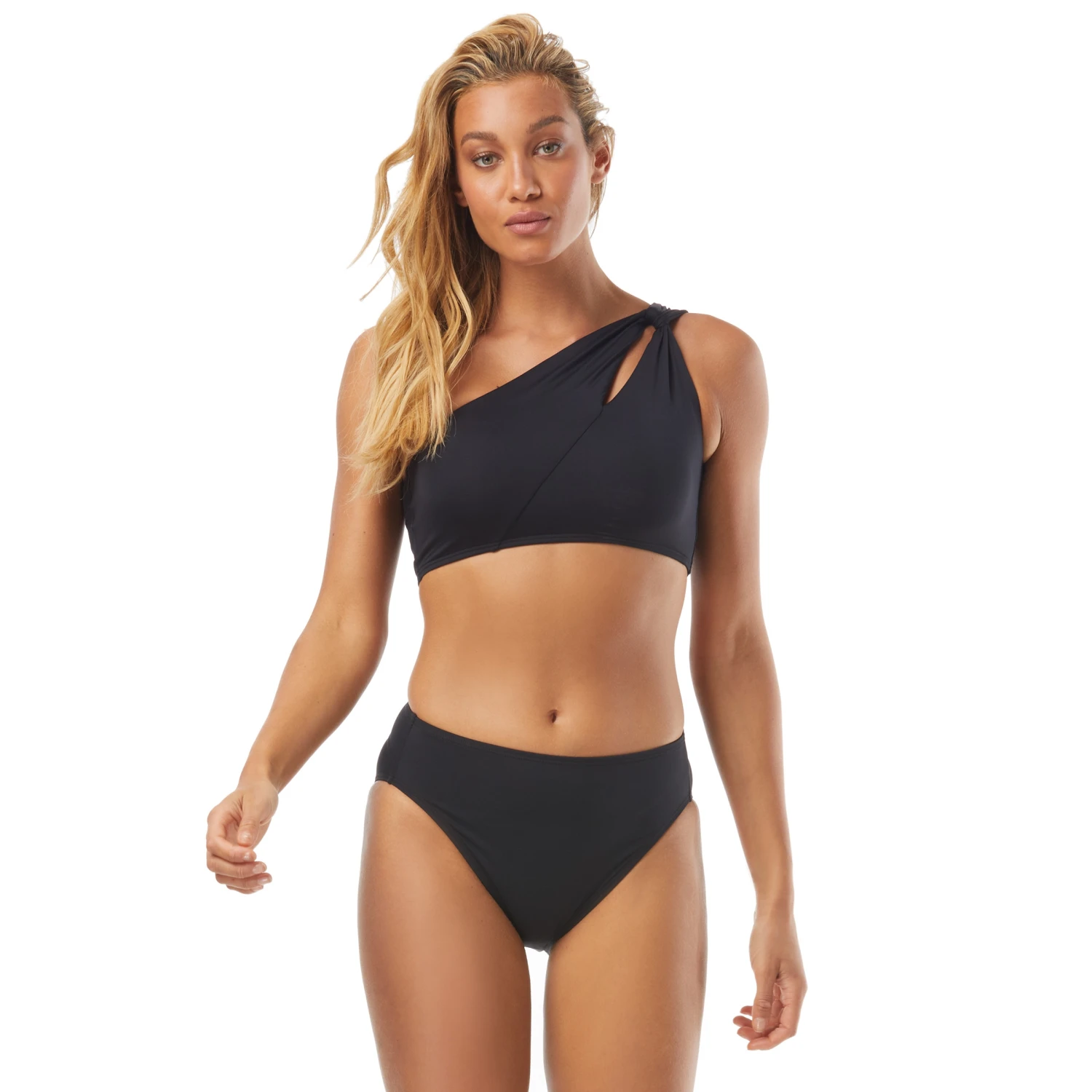 A classic bikini top with a sexy cut out twist! This Carmen Marc Valvo One Shoulder Cut Out Bikini Top features a cut out neckline with a twisted shoulder detail and removable soft cups for the bikini top you’ll never want to take off.