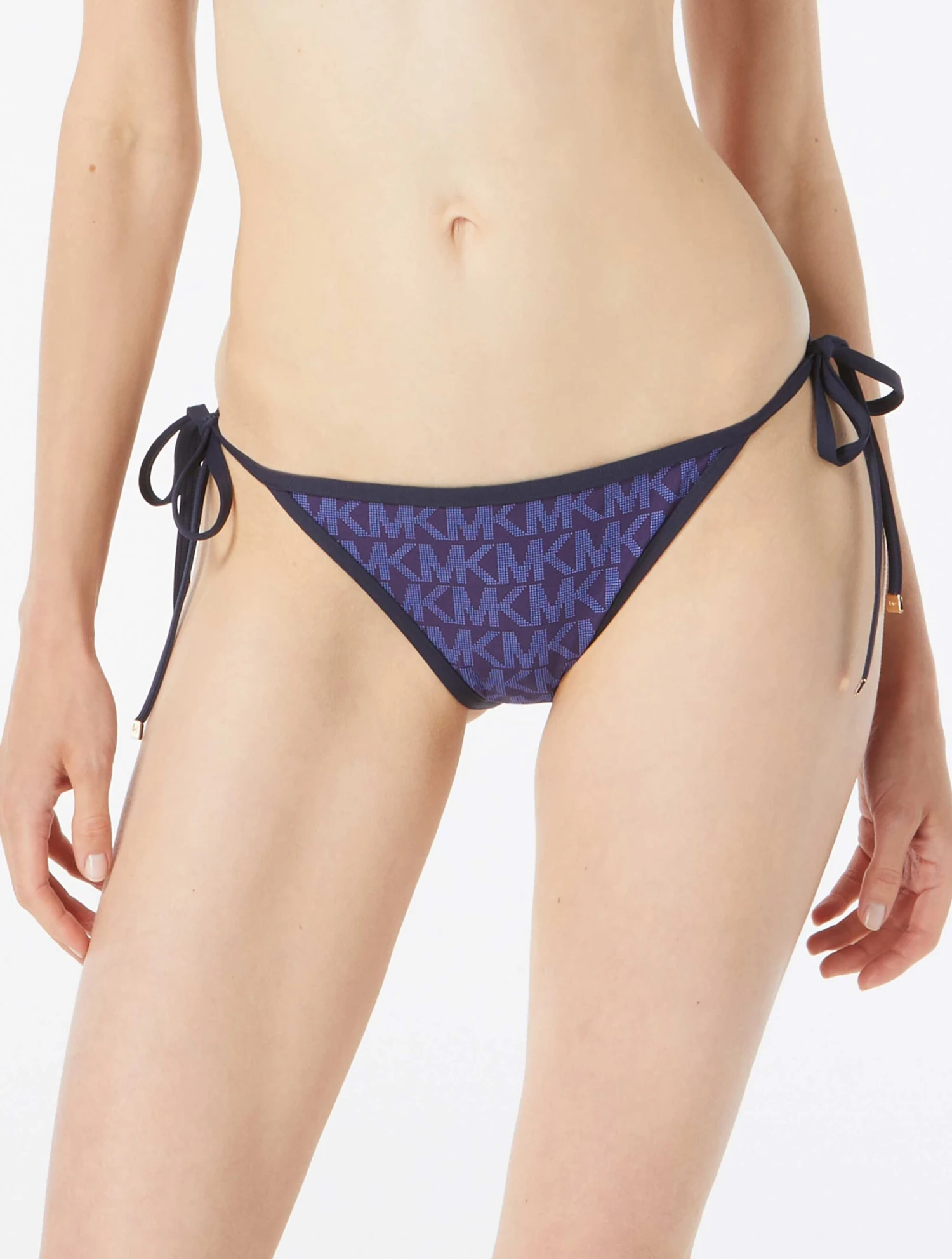 A basic bottom with a designer detail, the MICHAEL Michael Kors String Bikini Bottom features an all over signature MMK logo print and adjustable side ties for a versatile fit.