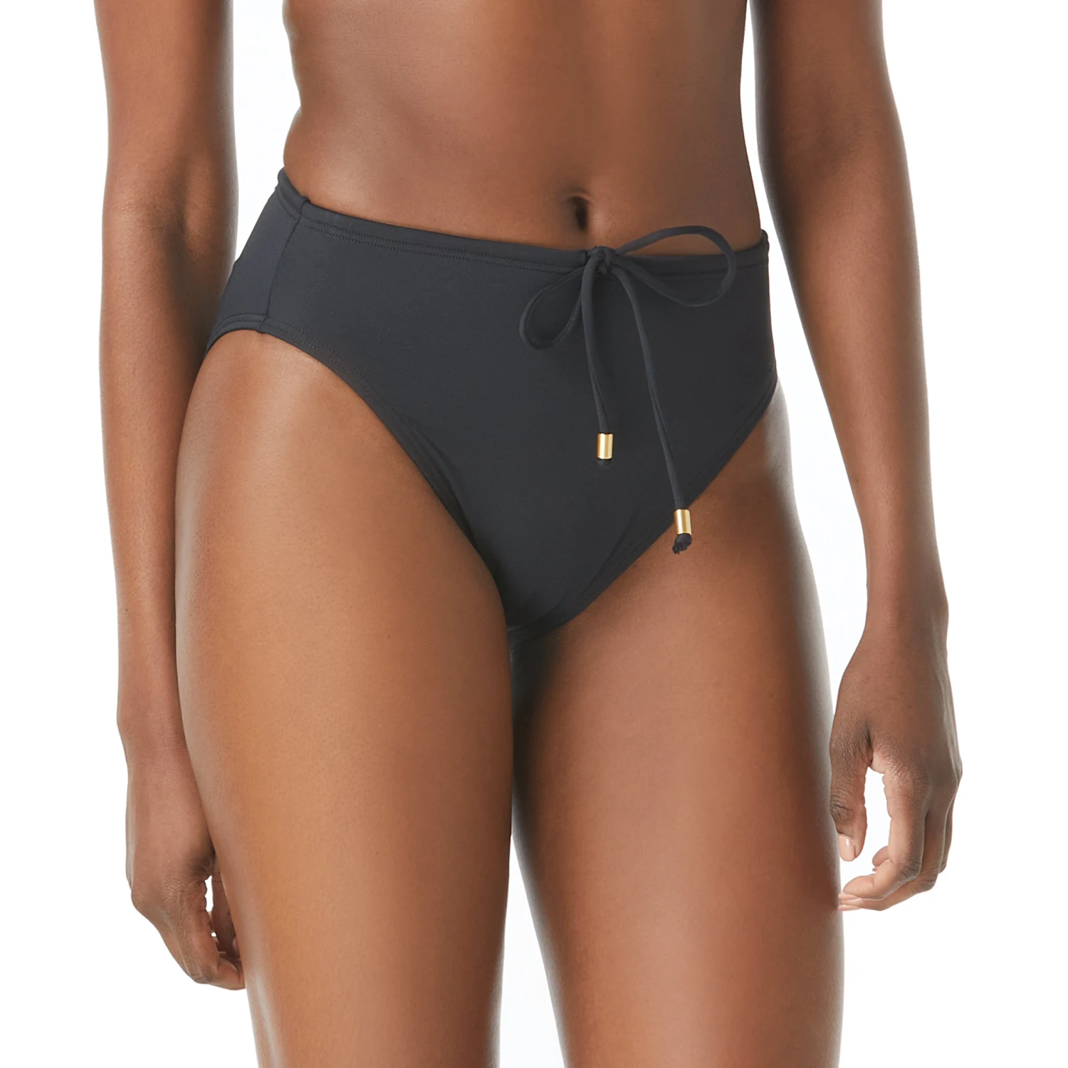 A modern high waist is accented by a drawstring with gold-tone beads at the cord ends for a little extra flash in Vince Camuto’s sleek bikini bottoms.
